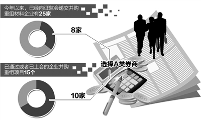 初步统计,今年1月以来,已经向证监会递交并购重组材料的企业有25家,8家选择A类券商。已通过或者已上会的企业并购重组项目15个,A类券商承接的达到10起。并购重组项目的集聚效应明显。