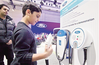 一名小观众在了解福特汽车的最新车辆充电设备,它能在三四个小时内为汽车充满电。