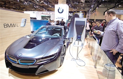 2月16日,在加拿大多伦多城市会议中心,观众参观一辆BMW i8混合动力概念车和其充电站。 新华社发