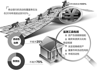 中国银监会正式发布《商业银行流动性风险管理办法(试行)》,引入流动性覆盖率作为监管指标,存贷比75%的红线未改变。此外,风险监管指标进一步细化,分为“硬杠杠”和“软考核”两部分——“合规性的监管指标”和“监测工具”。