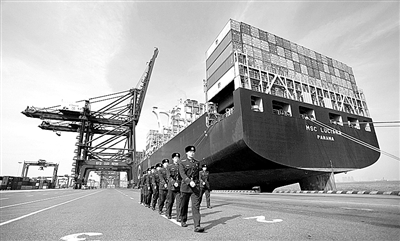 2014年1月,大连港货物吞吐量3779.8万吨,同比增长4%;集装箱吞吐量74.6万TEU(标准箱),同比增长8.7%。这是2月18日,大连大窑湾边防检查站官兵正在大窑湾港口巡逻执勤。 本报记者 苏大鹏摄
