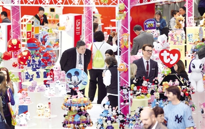 2月18日,参展商在纽约玩具展览会上与顾客交流。当日,来自世界100多个国家的1100多家参展商齐聚2014纽约国际玩具展览会,展出超过15万件玩具、游戏和最新设计。 新华社发