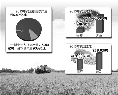 近几年我国粮食进口增长较快,2013年,谷物进口接近1500万吨,大豆进口突破6000万吨。“尽管进口在增加,但谷物净进口量占国内生产量的比重不大,约2.5%,是安全可控的。从品种看,中国小麦、稻谷供求基本平衡,紧平衡的是玉米,近几年国家加大对玉米生产的政策扶持,面积和产量都在增加,供需缺口没有出现大的变化。”张辉介绍说,2013年国内玉米丰收,增产超过200万吨。玉米同期进口量326.6万吨,比上年下降近四成。他表示,今后随着国家强农惠农富农政策力度不断加大,农田水利等基础设施建设不断加强,农业机械化水平、农业科技进步贡献率持续提高,预期在粮食综合生产能力不断增强的背景下,未来国内粮食供需格局是基本稳定的,谷物进口一般不会出现大幅增加的情形。