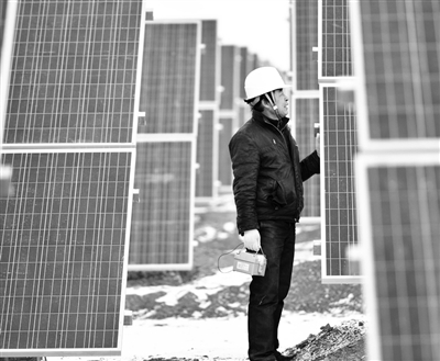 日前,一名技术人员在甘肃阿克塞光伏发电基地内检查设备。甘肃省2014年将更加注重光伏产业就地消纳,通过积极建设配套智能电网工程和引导耗能产业向新能源富集地区转移等方式缓解调频调峰、电力电量消纳等问题。
