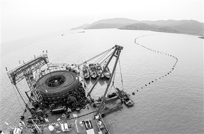 2月21日清晨,51公里长的海缆开始敷设入海。当日,51公里长的国产单根电压等级最高、长度最长的直流海缆在浙江舟山海域敷设入海,这标志着世界首个五端柔性直流输电示范工程进入后期攻坚阶段。 新华社记者 徐 昱摄