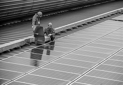 2月19日,浙江德清县供电公司工作人员检查已经并网的企业光伏屋顶。浙江省德清县临杭工业区天马重工机械有限公司厂区的屋顶光伏项目一期工程已于2014年初并网发电。目前该光伏工程一期面积20万平方米,共安装6.3万块光伏板,每年可发电1600万千瓦时。项目一期日平均发电量约5万千瓦时,最高每天可发电8万千瓦时,并网一个多月运行平稳,初现成效。 新华社记者 徐 昱摄