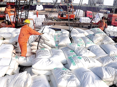 2月23日,码头工人在连云港港口码头吊装转运刚从货轮上卸下的春耕化肥。眼下已进入春耕时节,江苏连云港港口设立农用物资专用绿色通道,实施24小时预约,对春耕化肥实行快速验放。 王 春摄(新华社发)