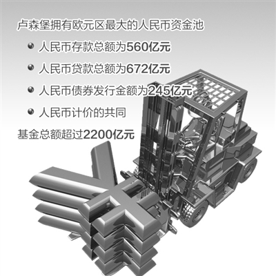 卢森堡目前不仅是欧洲最大的人民币业务处理中心之一,而且也是欧洲最大的人民币证券结算中心和主要的人民币计价债券发行地。卢森堡金融机构提供的最新数据资料显示,卢森堡拥有欧元区最大的人民币资金池,人民币存款总额为560亿元,人民币贷款总额为672亿元,人民币债券发行金额为245亿元,人民币计价的共同基金总额超过2200亿元。