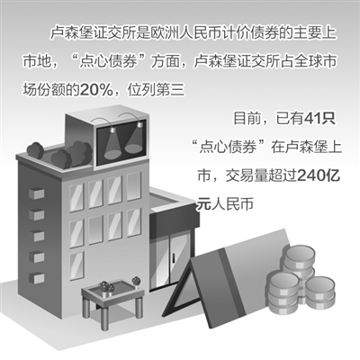 作为主要的欧洲债券上市中心,卢森堡证交所是欧洲人民币计价债券的主要上市地之一。2011年5月,卢森堡证交所是第一个发行“点心债券”的欧洲证交所。如今,在“点心债券”上市方面,卢森堡证交所已经拥有20%的全球市场份额,继中国香港特区和新加坡之后排名世界第三。目前,来自29个国际发行人的41只“点心债券”(交易量超过240亿元人民币)在卢森堡证交所上市,其中包括由卡特彼勒和大众汽车发行的“点心债券”。在所有人民币计价债券发行人中,金融机构占65%,企业和国际组织分别占28%和7%。