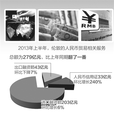 包墨凯:伦敦的人民币金融产品和服务种类较为齐全,包括外汇交易、支付和现金管理、存款储蓄、贸易服务、信用证、供应链服务、进出口融资等。伦敦金融城一月中旬发布的人民币交易报告中提到,2013年上半年,人民币贸易相关服务持续稳定增长,伦敦市场的人民币信用证规模已达到33亿元。人民币外汇交易额也出现大幅增长,上半年日均人民币外汇交易额增长最为迅猛,达到48亿美元,较上年同期几乎翻了一番。与2011年同期数据相比,人民币计价的贸易量在过去两年时间里增长了3倍。