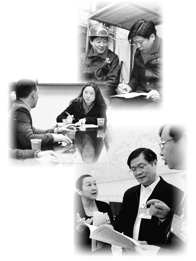 右图 3月2日,北京会议中心,参加全国政协十二届二次会议的妇联界委员龙倩(左一)与同驻地的委员一起交流履职情况,对即将召开的大会充满期待。