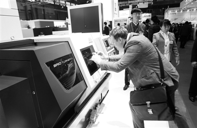 第八届中国数控机床展览会日前在上海举办。图为沈阳机床推出的首款智能机床在展会上引起海外客户关注。智能机床是基于信息驱动技术,以互联网为载体、以给客户提供轻松制造为核心,使人、机、物有效互联的新品类机床,体现了国产机床在工业生产高度自动化的最新进展和成果。