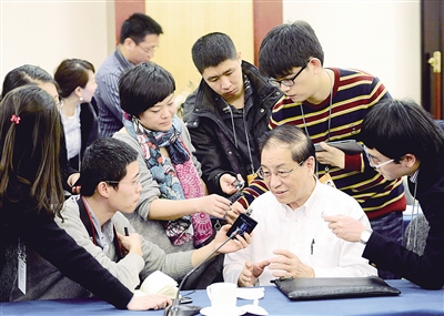 右图 3月4日,参加本次政协会议的经济界委员小组讨论,刘明康委员(中)会后就互联网金融等问题接受记者采访。