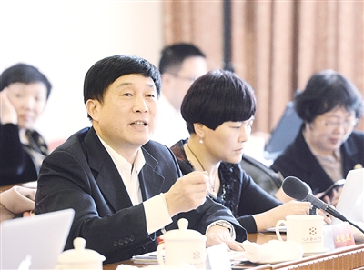3月7日上午,人大天津代表团在驻地分组审议政府工作报告、审查计划报告和预算报告。图②为周振海代表(右)发言。