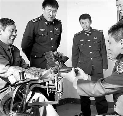 “冰城活雷锋”孟广斌将修好的皮鞋交到官兵手中。