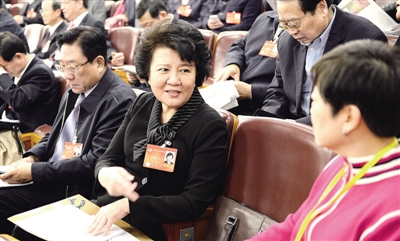 3月10日下午,十二届全国人大二次会议举行全体会议,列席会议的政协委员裘援平(中)在与其他委员交流。