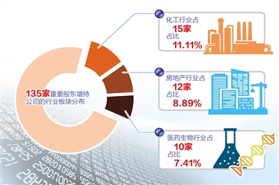 另据Wind数据显示,按照申万一级行业板块统计,从目前这135家重要股东增持公司的行业板块分布情况来看,化工行业占15家,占比11.11%,是占比最高的行业;此外,房地产和医药生物行业板块紧随其后各占12家和10家,分别占比8.89%和7.41%。