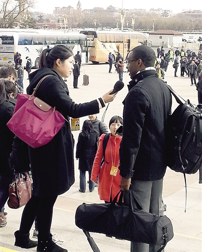 3月12日,全国政协十二届二次会议在北京人民大会堂闭幕。当日上午,在人民大会堂东门前,参加两会报道的记者抓紧时间进行采访,图为一家电台记者正在对境外媒体同行进行采访。