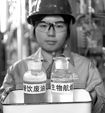 工作人员正在展示餐饮废油和生物航煤。