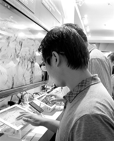 平板电脑已经成为移动智能终端的新宠,上网、看视频,甚至打电话等多种功能于一身。作为继电脑、手机之后的“第三屏”,平板电脑市场正在高歌猛进,竞争也进入白热化阶段。图为参观者在用平板电脑查看内容。 亦不凡摄