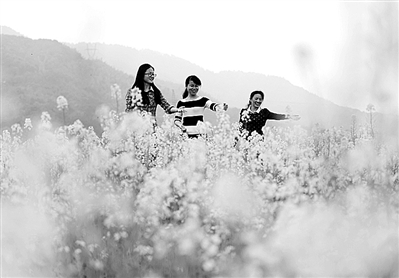 3月18日,游客在江西南昌市湾里区太平镇泮溪村欣赏油菜花。