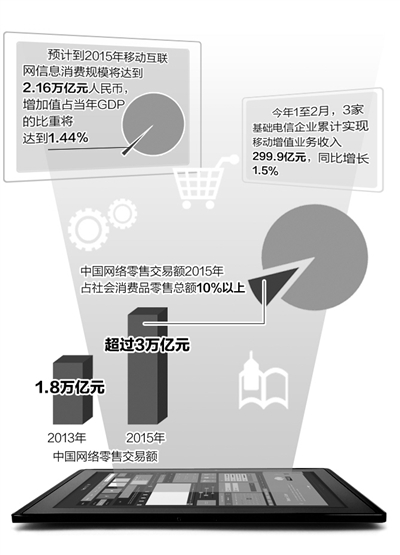 本报北京3月20日讯 记者黄鑫报道:在今天举行的2014中国互联网大会新闻发布会上,中国互联网协会秘书长卢卫表示,基于移动互联网的信息消费已成为创新最活跃、渗透性最强,影响面最广的领域,预计到2015年,移动互联网信息消费规模将达到2.16万亿元人民币,移动互联网信息消费增加值占当年GDP的比重将达到1.44%。