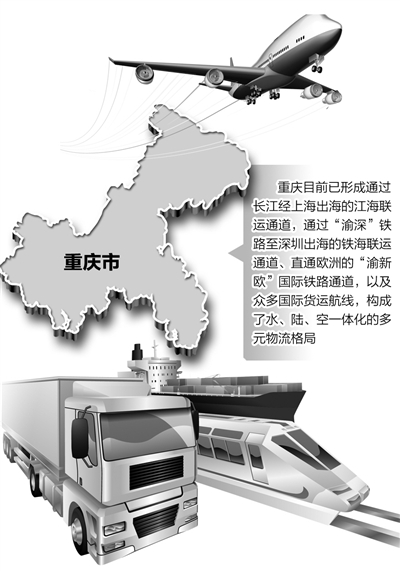 重庆市近年推进内陆开放,通过构建国际物流大通道,缩短与世界的距离。重庆市外经贸委相关负责人表示,重庆目前已形成通过长江经上海出海的江海联运通道,通过“渝深”铁路至深圳出海的铁海联运通道以及直通欧洲的“渝新欧”国际铁路通道,加上众多国际货运航线,构成了水、陆、空一体化的多元物流格局。未来,重庆还将开辟经云南、广西至东盟的出海通道。