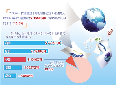 2013年,全球通过PCT途径提交的国际专利申请共20.5万件,同比增长5.1%,创历史新高。美国、日本、中国、德国和韩国分列前5名,我国首超德国居第三位;占全球总量的份额达到10.5%,较2012年提高近1个百分点。
