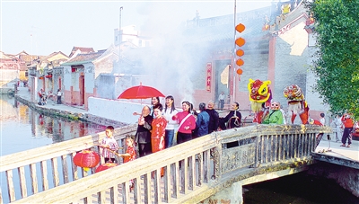 踏进古村西门,映入记者眼帘的仿佛是一幅岭南画派的佳作:清亮的水塘穿过村中央,成排的明清古祠堂倒影于碧波中,伫立塘边500多年的古榕树和横卧塘上的古石拱桥相互映衬——水彩画的光影和国画的拙朴神韵尽在其中。