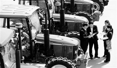 3月21日,山西运城农机大市场,一家保险公司的业务员向农户推介保险产品。为更好地服务春耕,山西运城农机大市场今年新增了农机维修、旧车交易、农机投保、质量投诉等服务项目,为农民购机提供了便利。 鲍东升摄(新华社发)