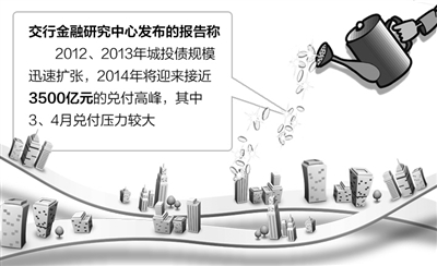 交行金融研究中心发布的报告称,由于2012年、2013年城投债规模迅速扩张,2014年将迎来接近3500亿元的兑付高峰,其中3月、4月兑付压力较大。城投债集中到期考验地方政府的融资能力,同时或将加大一级市场供给,对二级市场造成冲击。