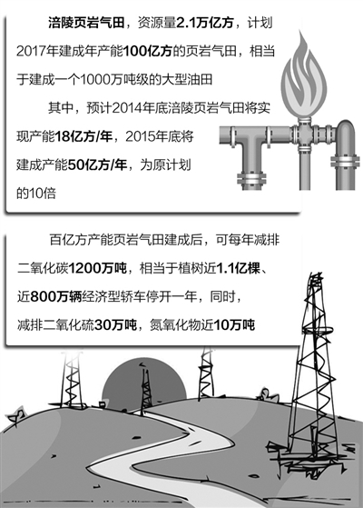 根据现有地质资料和产能评价,位于重庆的涪陵页岩气田资源量2.1万亿方,计划2017年建成年产能100亿方的页岩气田,相当于建成一个1000万吨级的大型油田。其中,预计2014年底涪陵页岩气田将实现产能18亿方/年,2015年底将建成产能50亿方/年,为原计划的10倍。