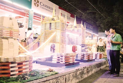 3月25日,在越南胡志明市,读者在图书展上欣赏形状犹如伦敦塔桥的“书桥”。