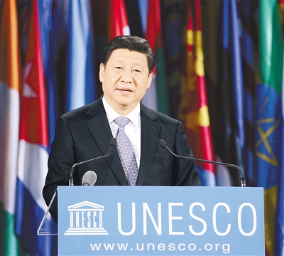 当地时间上午10时40分许,习近平在联合国教科文组织总干事博科娃女士的陪同下步入演讲大厅,全场起立欢迎。在热烈的掌声中,习近平发表演讲。
