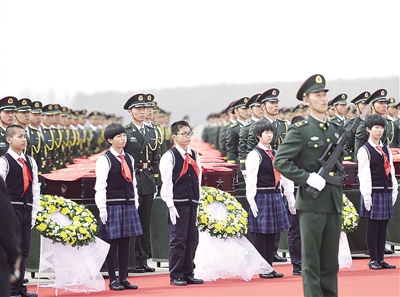 3月28日,少先队员向烈士遗骸敬献花圈。