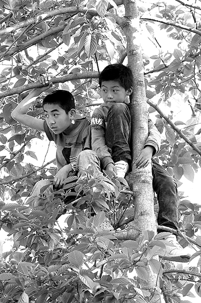 听说在学校附近的梯田里有表演,下午一放学,哈尼族的孩子们就早早地跑到田边来了。这两位三年级的小朋友把树当成最好的专座,稳稳地看起了表演。这地方可没人跟他们抢! 草帽车/摄