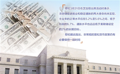 耶伦3月31日在芝加哥出席活动时表示,近期的一些经济数据印证了许多美国人的感受,美国经济和就业市场仍然疲弱。她说,美联储促进就业和稳定通胀的两大使命尚未实现,失业率的正常水平应在5.2%至5.6%之间,低于目前的6.7%,通胀水平也远远低于美联储设定的2%的长期目标。