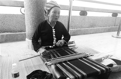 海南省五指山市黎族妇女正在织黎锦,向游客们展示手工艺品。农历三月初三,是黎苗同胞最为重要的传统佳节,也成为重要的旅游日。 本报记者 何 伟摄