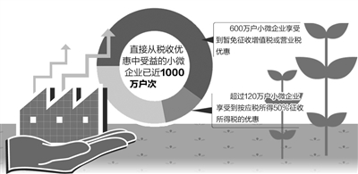 正是由于小微企业在经济发展和民生改善中地位重要,近年来,我国从财税、金融等方面出台多项措施扶持小微企业发展。目前,直接从税收优惠中受益的小微企业已近1000万户次。其中,一方面是对年应纳税所得额低于6万元的小型微利企业,其所得按50%计入应纳税所得额后征收企业所得税。目前,有超过120万户小型微利企业申报享受该优惠政策。另一方面,自2013年8月1日起,对小微企业中月销售额或营业额不超过2万元的增值税小规模纳税人和营业税纳税人,暂免征收增值税或营业税,这一政策使600万户小微企业受益。
