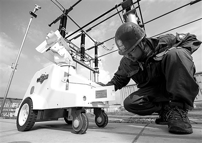 4月3日,国网重庆市电力公司检修分公司北碚运维站站长杨剑飞在检查巡检机器人。当日,在国家电网重庆电力公司220千伏大石智能变电站内,重庆市首台变电站智能巡检机器人正式投入运行。