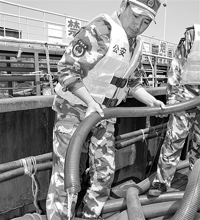 3月18日,福建省莆田市公安边防支队查获一起特大买卖非法成品油案,缴获成品油1132吨,抓获涉案嫌疑人员7名,案值900余万元。图为边防官兵正在检查被查扣的涉案油船。 林建明摄