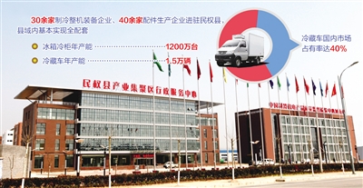 置身民权高新区,犹如走进了国内制冷业知名品牌博览会。万宝、澳柯玛、香雪海、华美、冰熊、兆邦、阿诗丹顿、奥爱斯等知名企业相继映入眼帘,30余家整机装备企业、40余家配件生产企业,县域内基本实现全配套,冰箱冷柜和冷藏车年产能分别达1200万台、1.5万辆,冷藏车国内市场占有率达40%,稳居同行业之首。这里不仅被中国轻工业协会、中国家电协会联合命名为“中国制冷设备产业基地”,更是被科技部评定为“国家火炬计划特色产业基地”。