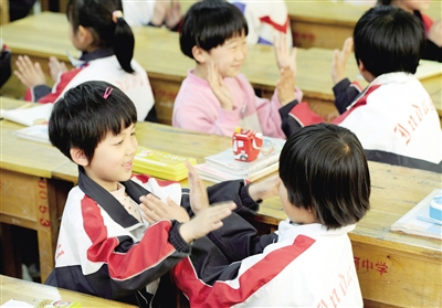 | 山东滨州市下河乡实验学校的学生们正在做文明友善互动游戏,该校开设了“四德”教育课,培养学生树立良好的人生观、价值观。 |