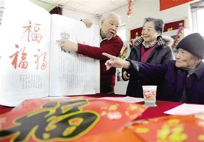 | 北京右安门街道开阳里第三社区的刘敬和(左一),带着自己刚出版的《福在身边》画册,与社区的老人们共享,增进邻里和谐。 |