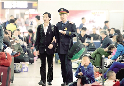 | 北京西站036候车室客运员耿谊(右)热心为旅客服务。036候车室开展“诚心待客、热心服务、真心助人、实心爱岗”活动,坚守旅客至上的理念。 |