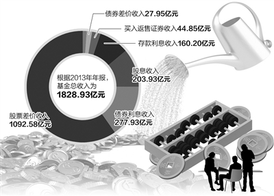 从基金的收益来源看,对比2013年和2012年年报,基金总收入相差120多亿元。2013年股票差价收入成为“赚钱”大头,其次是债券利息收入,股息收入位列第三。