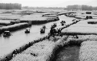 游客在江苏泰州市千垛油菜花田观赏油菜花。