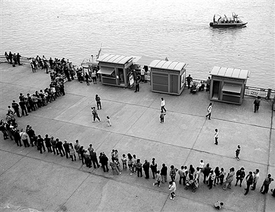 4月7日,在广西柳州市水上公交起点站南车渡码头,等待上船的市民排成长龙。广西柳州市3月31日正式开通运营水上公共交通系统后,由于柳江两岸风光秀丽、水上公交价格便宜,市民乘坐水上巴士环江游的热情高涨。据统计,水上公交巴士开通运营一周来,已有近2万多市民过了一把“水上巴士瘾”。 (新华社发)