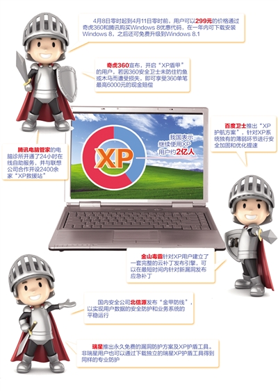 对此,安全软件厂商早已各显神通,纷纷以此为契机再“圈”用户。4月8日,奇虎360宣布网购先赔在原有赔付条件下,将翻倍提升XP用户的保障金额度,开启“XP盾甲”的用户,若因360安全卫士未防住钓鱼或木马而遭受损失,即可享受360单笔最高6000元的现金赔偿。360还透露,已有超过2亿用户安装并激活了360安全卫士XP盾甲。