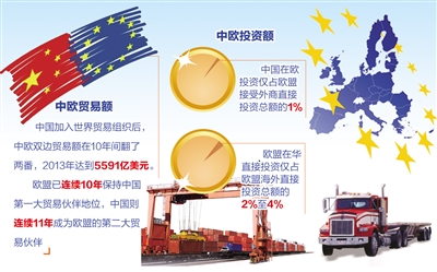 中国加入世界贸易组织后,中欧经贸合作呈现“爆发式”增长。中欧双边贸易额在10年间翻了两番,2013年达到5591亿美元。欧盟已连续10年保持中国第一大贸易伙伴地位,中国则连续11年成为欧盟的第二大贸易伙伴,中欧经贸关系已是世界上规模最大、最具活力的经贸关系之一。